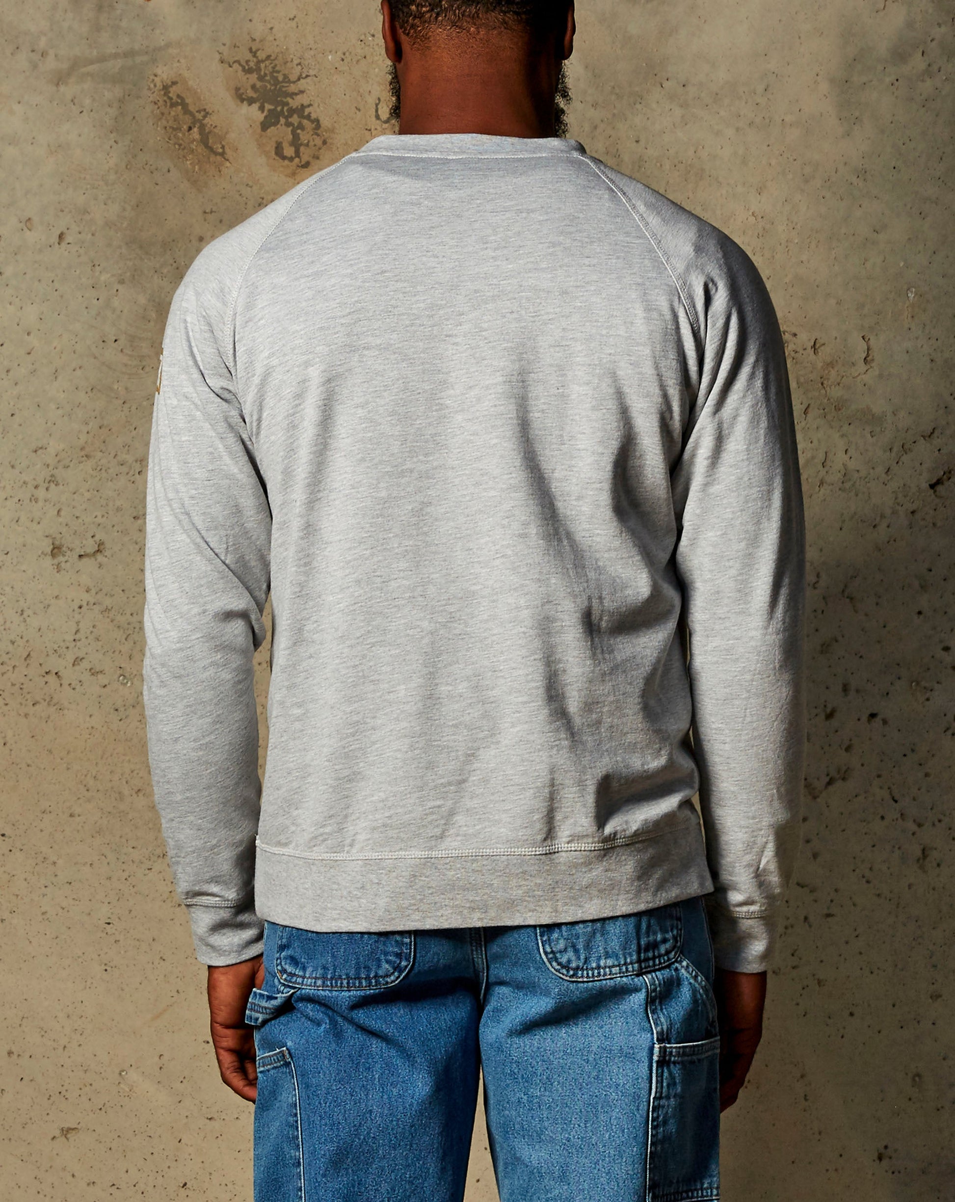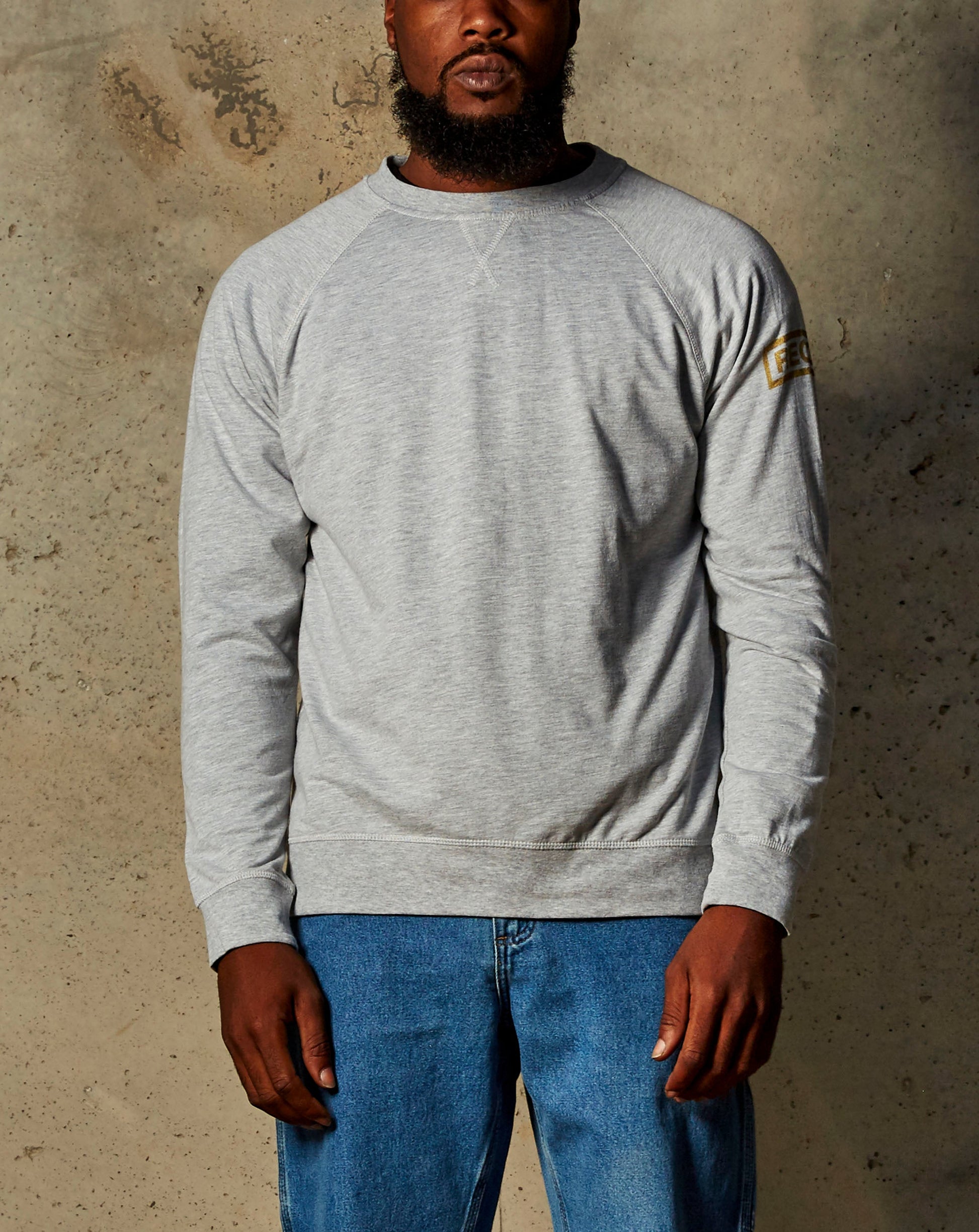 French Terry cotton garment with X stitching at the neck and raglan sleeves. Metallic gold print on the left arm.