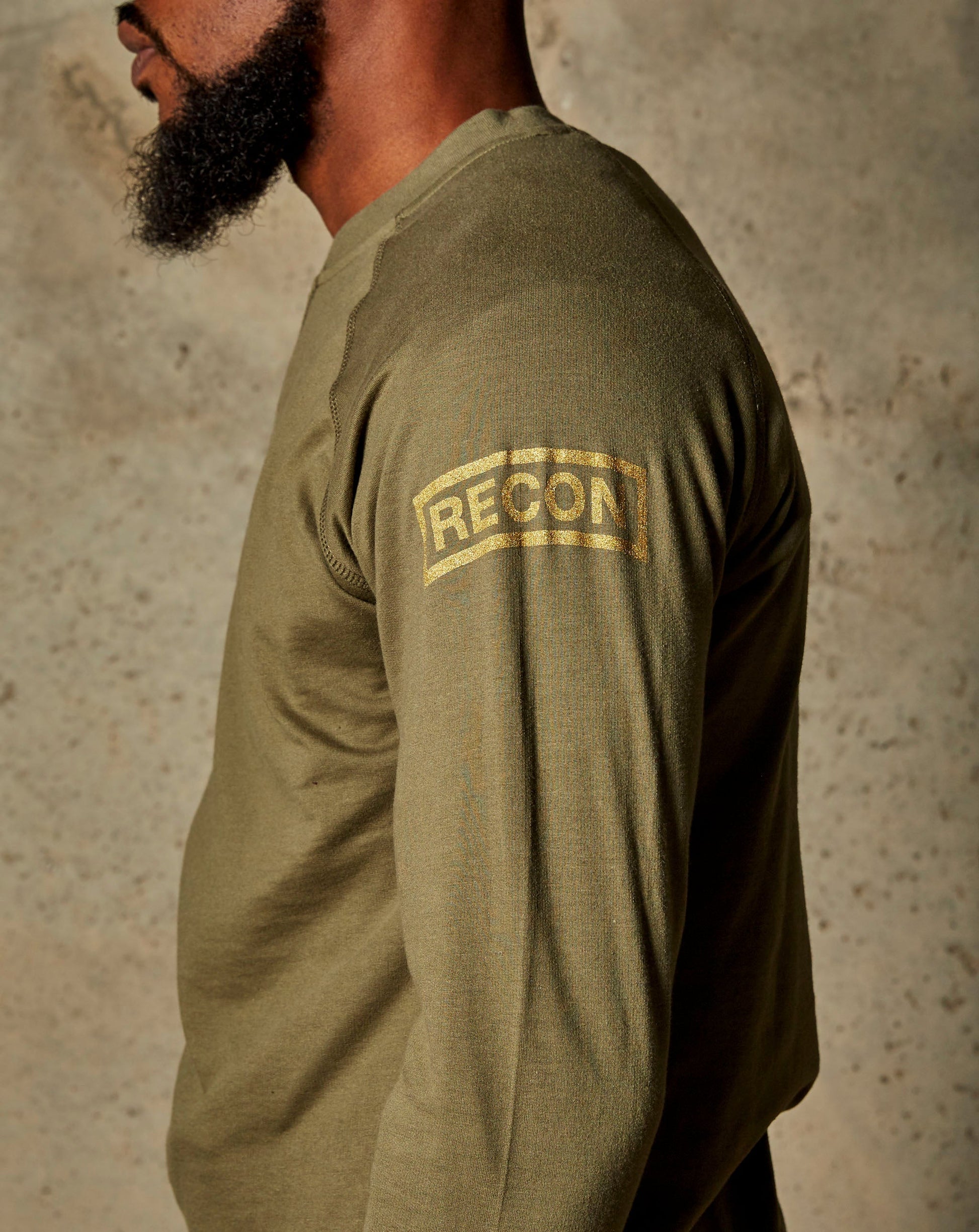 French Terry cotton garment with X stitching at the neck and raglan sleeves. Metallic gold print on the left arm.