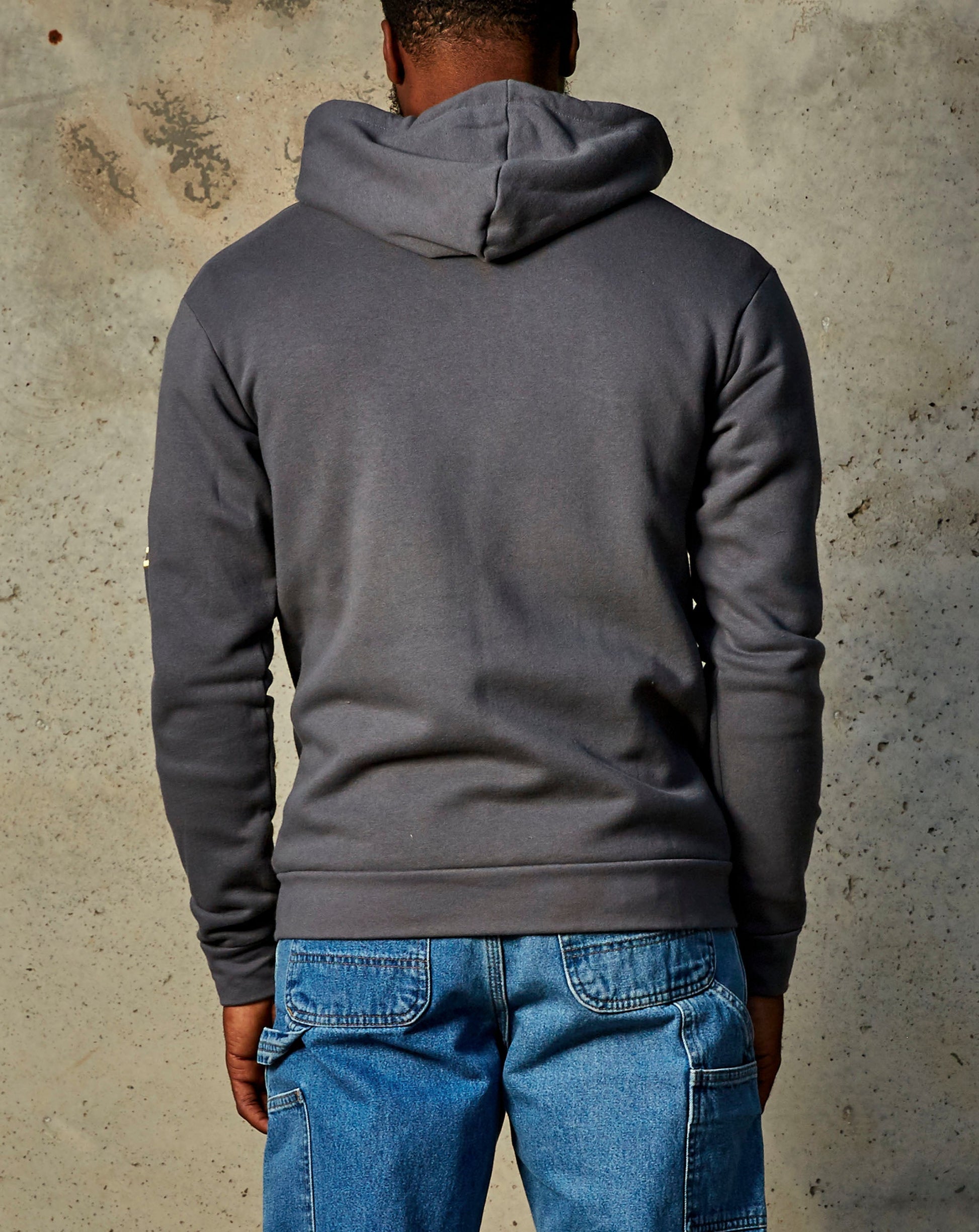 Full-zip hoodie, off-white draw strings with metallic gold threading on the chest and left arm as well as 2 front pockets.
